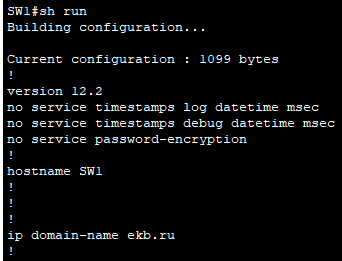 Теперь давайте проверим настройку доменного и сетевого имени. Для этого нам требуется посмотреть текущую конфигурацию(running-config). В этом нам поможет команда #show running-config. Можно сократить до sh run, а если еще в начале добавить do, то можно использовать из любого режима конфигурации. Смотрим результат на рисунке 1.3