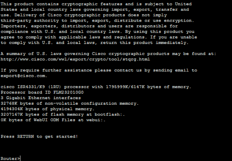 Сначала оно затребует пароль. У учебного оборудования, для удобства, он везде одинаковый: cisco